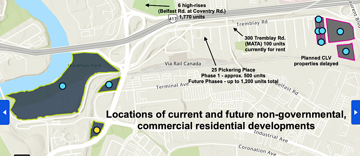 The above map ndicates locations of POSSIBLE future residential developments in the area currently held in the Federal Government's Canada Public Land Bank Inventory. This map shows that there could be as many as 4,800 units in the Inventory.